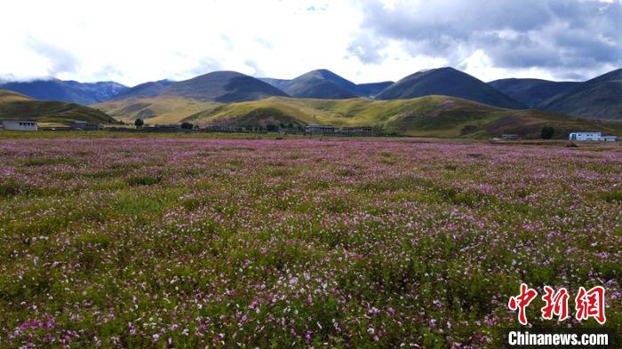 稻城縣噶通鎮(zhèn)八美村位于亞丁機場前往亞丁景區(qū)的交通要道上。長期以來,這片草原沙化現(xiàn)象日益嚴(yán)重,當(dāng)?shù)卮迕褓囈陨娴膫鹘y(tǒng)放牧都難以為繼。2016年以來,稻城縣利用生態(tài)治理工程實施的契機,整合全域旅游和脫貧攻堅等涉農(nóng)涉旅資金,在沙化草原上大面積種植格?;ǎ瑢?599畝沙化草地打造成色拉花海。