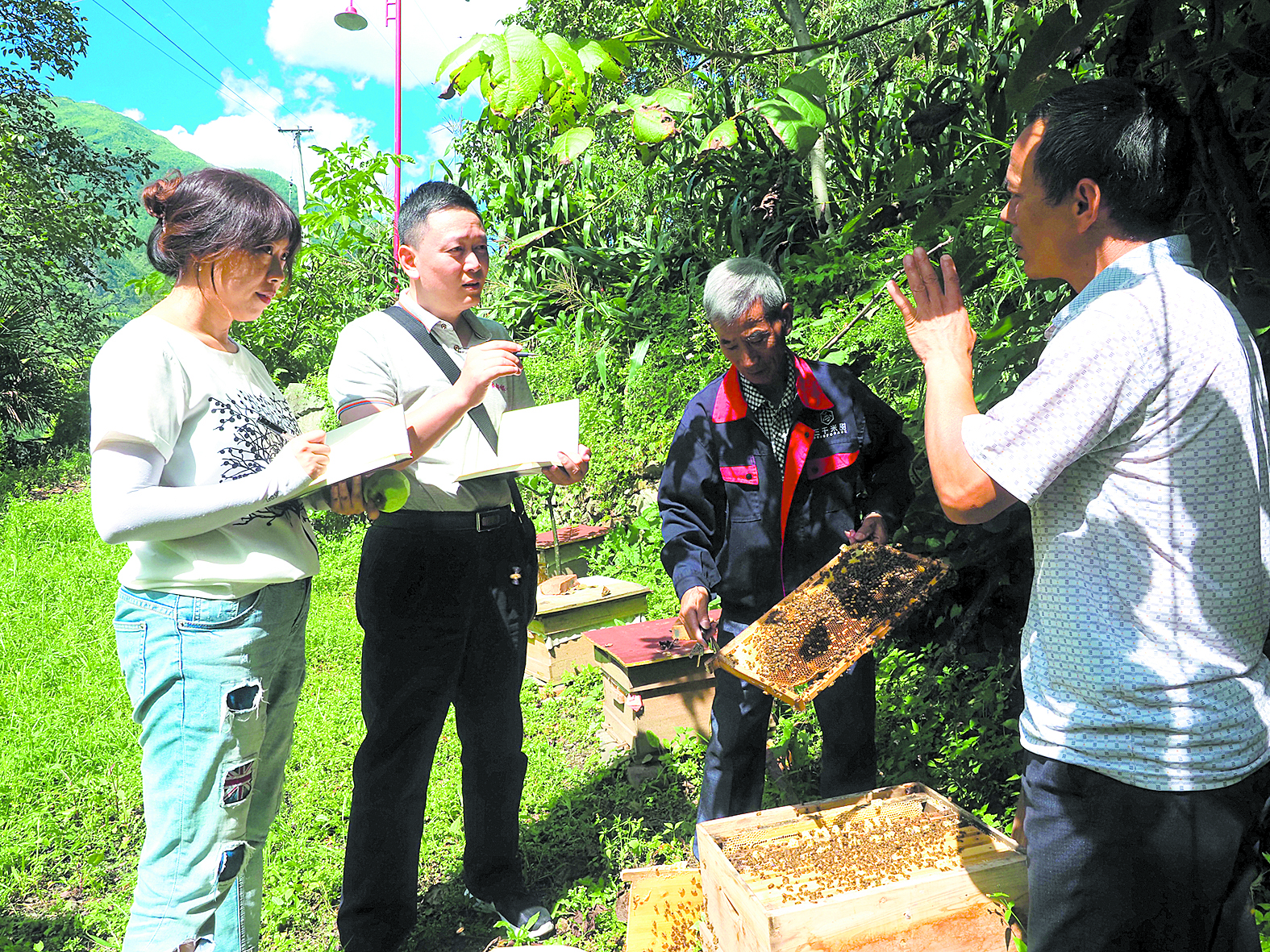 回轉(zhuǎn)身去,蒲江縣對(duì)口援助瀘定工作隊(duì)隊(duì)長(zhǎng)吳孟賢正和張洪彬攀談著今年的蜜蜂增收情況。“蒲江縣新增財(cái)政幫扶資金277萬(wàn)元作為獎(jiǎng)補(bǔ)資金,激勵(lì)成都三千米甜蜂業(yè)有限公司落戶瀘定發(fā)展的‘貢嘎中蜂’養(yǎng)殖支援項(xiàng)目,現(xiàn)在已經(jīng)累計(jì)發(fā)放貢嘎中蜂7500余群,幫助全縣38個(gè)貧困村發(fā)展村級(jí)集體經(jīng)濟(jì),示范帶動(dòng)800戶以上貧困戶增收。”吳孟賢滔滔不絕如數(shù)家珍,身旁飛過(guò)的貢嘎中蜂也似乎成了他和其他對(duì)口支援隊(duì)員的化身,他們從舒適的成都平原來(lái)到高原瀘定,懷揣堅(jiān)定的信念,用行動(dòng)肩負(fù)起責(zé)任與擔(dān)當(dāng),他們將藏族同胞的利益裝在心里、舉過(guò)頭頂,排除千難萬(wàn)險(xiǎn),因地制宜推動(dòng)當(dāng)?shù)匕l(fā)展;跋山涉水,進(jìn)居入戶,訪貧問(wèn)苦,為藏族同胞送上溫暖與關(guān)懷……他們用心血和汗水書(shū)寫(xiě)著一個(gè)大大的“愛(ài)”字,甜到藏族同胞的心坎上。