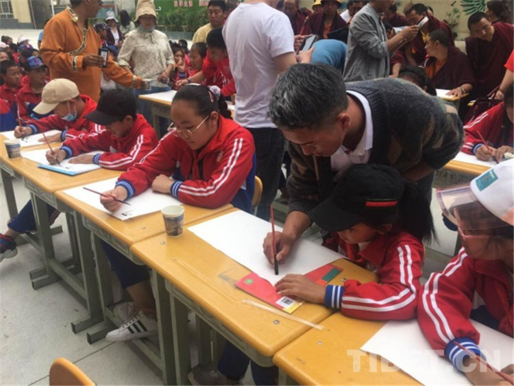 “右手拿筆,拇指和食指握住距離筆尖3厘米左右的位置,掌心中空書寫,對(duì),就是這樣?!眮碜运拇ㄊ〔匚膶W(xué)校、西南民族大學(xué)、康巴文化研究院、甘孜日?qǐng)?bào)社、甘孜民族中學(xué)、理塘?xí)覅f(xié)會(huì)等單位的14位書法家在縣城關(guān)小學(xué)為近100名小學(xué)生現(xiàn)場(chǎng)傳授和指導(dǎo)藏文書法書寫技巧和心得。