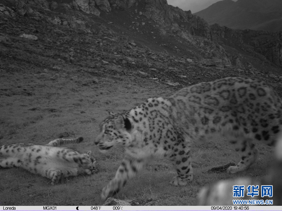 這是9月4日在祁連山東端的青海省海東市互助土族自治縣北山林場(chǎng)拍攝到的雪豹母子玩耍嬉戲的影像。新華社發(fā)