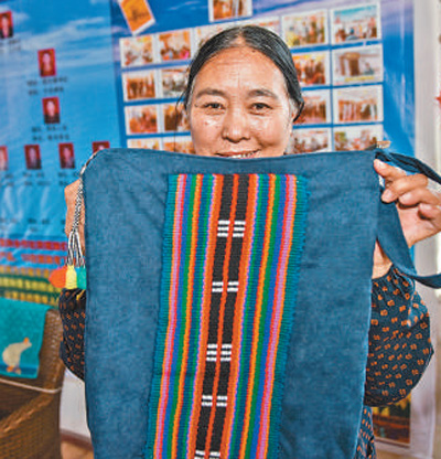 格爾木市長(zhǎng)江源村崗巴布民族手工藝品專業(yè)合作社的社員展示制作的工藝品。攝于2020年5月。新華社記者 吳 剛攝