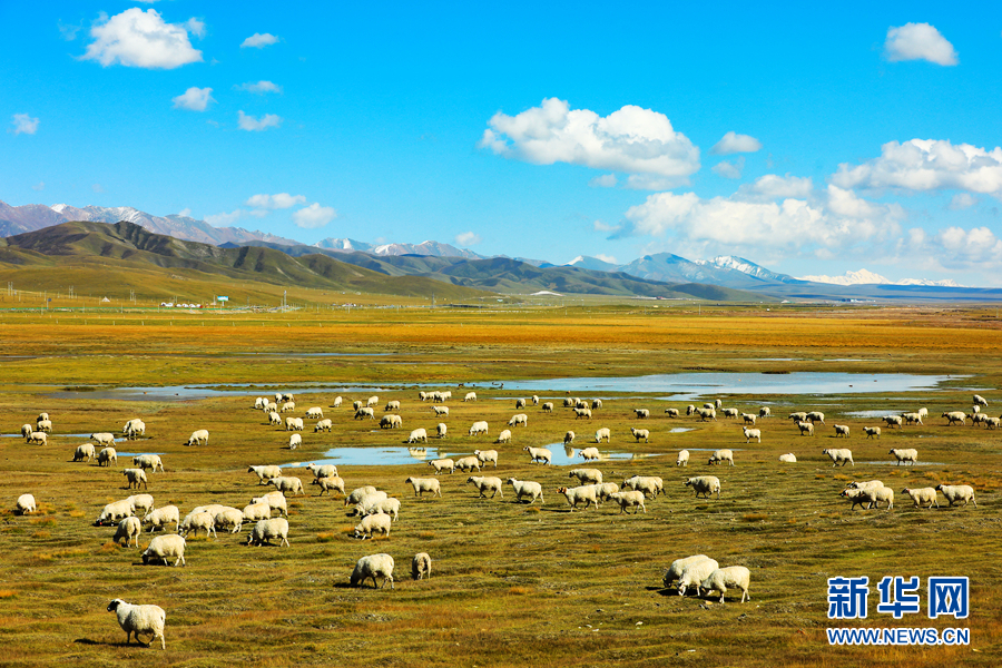 藍天白云之下,羊群悠閑自在地吃著草,與草原相映成趣。新華網(wǎng) 蘇金元 攝