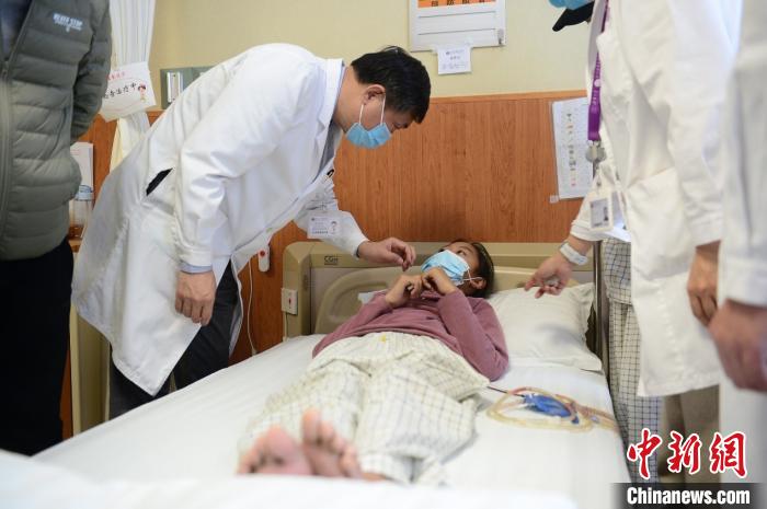 近日,一對來自青海玉樹、患肝包蟲病的姐弟在北京接受免費手術治療。手術由中國工程院院士、北京清華長庚醫(yī)院院長董家鴻親自主刀。圖為董家鴻院士為患者查房,了解病情?!巴摹す茶T中國心”基金 供圖 中新社 發(fā) “同心·共鑄中國心”基金 攝