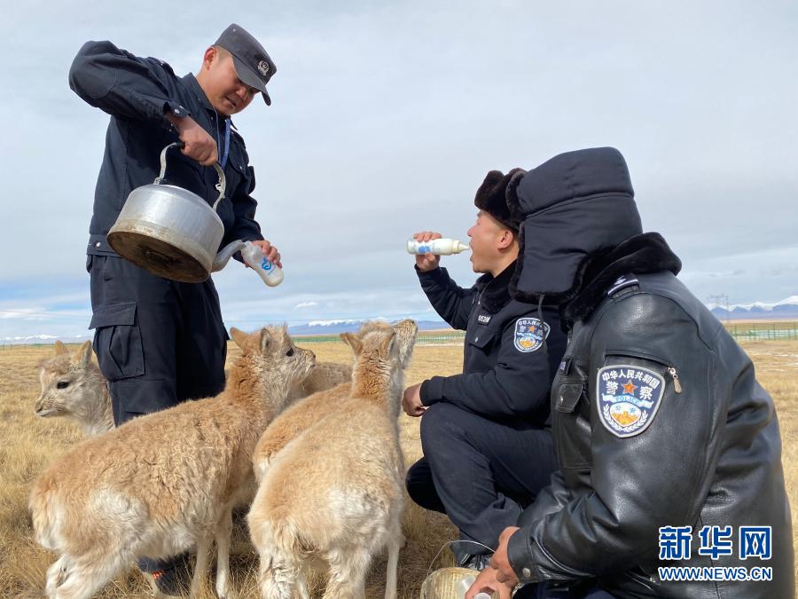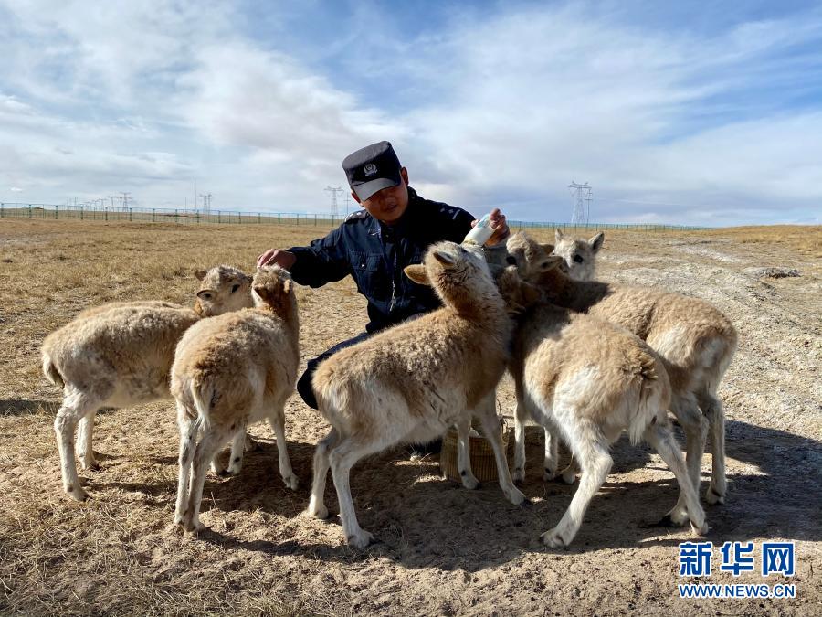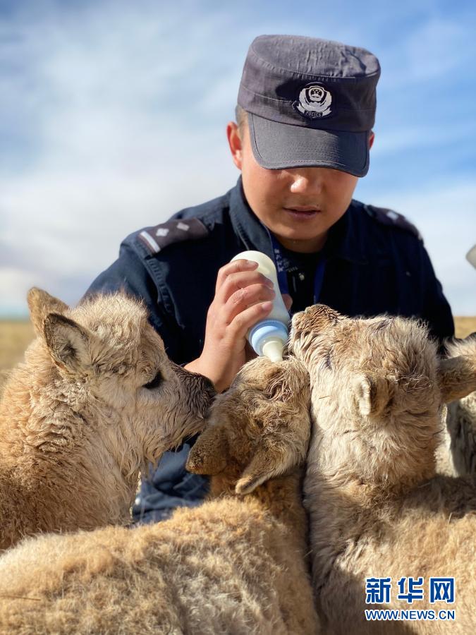 12月7日,可可西里巡山隊員達(dá)才在給藏羚羊幼仔喂奶。新華社記者 藍(lán)翔 攝