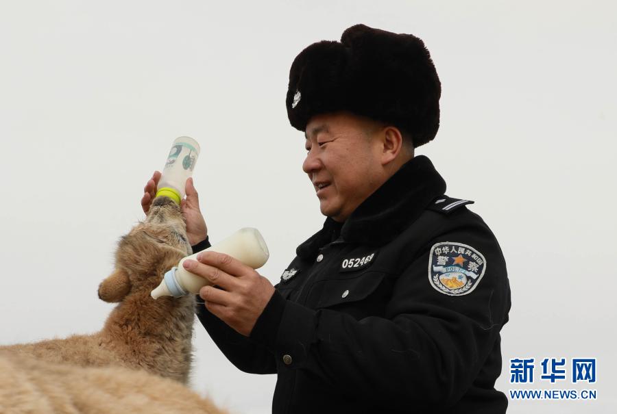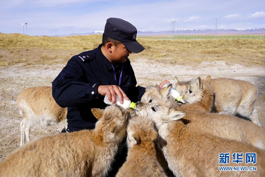 可可西里巡山隊員鄧海平給藏羚羊幼仔喂奶(12月6日攝)。新華社記者 王金金 攝