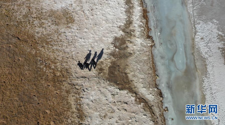 12月7日,站長趙新錄(中)與隊友鄧海平(左)、達(dá)才在可可西里索南達(dá)杰保護(hù)站管護(hù)區(qū)域內(nèi)巡查(無人機(jī)照片)。新華社記者 王艷 攝