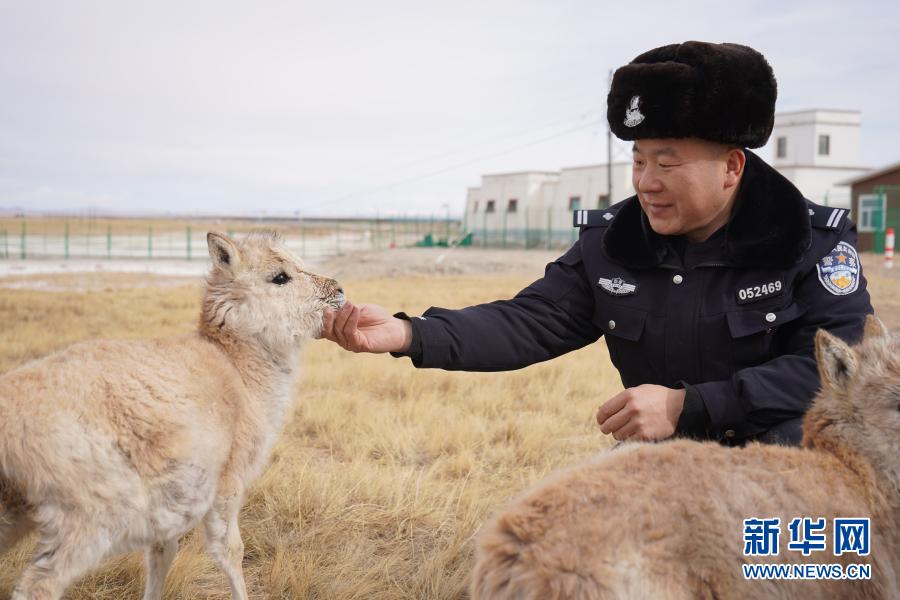 12月7日,可可西里索南達(dá)杰保護(hù)站站長趙新錄在撫摸藏羚羊幼仔。新華社記者 藍(lán)翔 攝