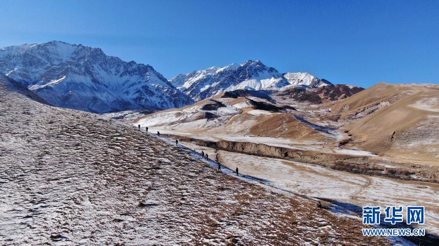 12月8日,祁連山國家公園扎麻什管護站生態(tài)管護員在巡護途中(無人機照片)。新華社記者 張宏祥 攝