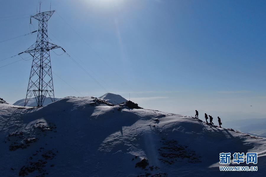 1月21日,國(guó)家電網(wǎng)西寧供電公司輸電運(yùn)檢中心運(yùn)檢人員在登山巡檢(無人機(jī)照片)。新華社記者 張龍 攝