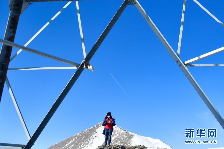 1月21日,國(guó)家電網(wǎng)西寧供電公司輸電運(yùn)檢中心運(yùn)檢人員董進(jìn)軍在測(cè)量線路耐張線夾溫度。新華社記者 張龍 攝