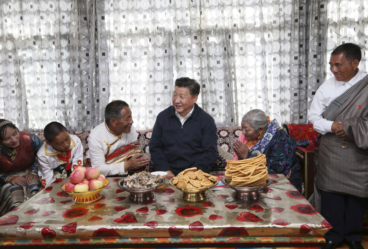 2016年8月22日,習(xí)近平總書(shū)記在青海省海西蒙古族藏族自治州格爾木市唐古拉山鎮(zhèn)長(zhǎng)江源村藏族村民申格家中同一家人親切交談。