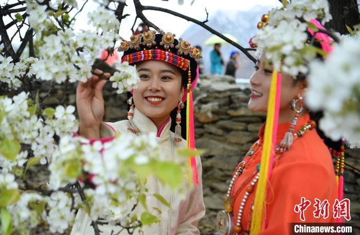 藏寨、碉樓下盛開(kāi)的梨花,丹巴女孩穿梭鄉(xiāng)間小路。劉忠俊 攝