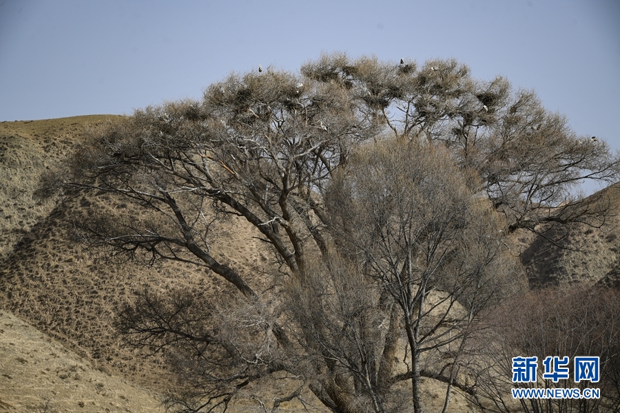 一群蒼鷺在貴德縣河?xùn)|鄉(xiāng)的一棵百年楊樹(shù)上嬉戲。新華網(wǎng) 潘彬彬 攝