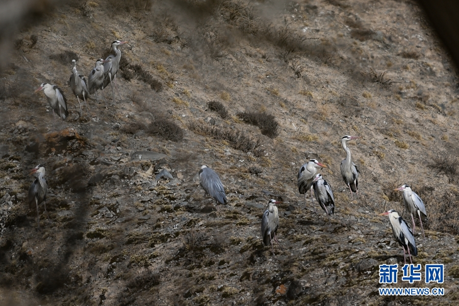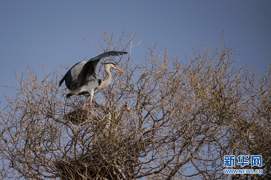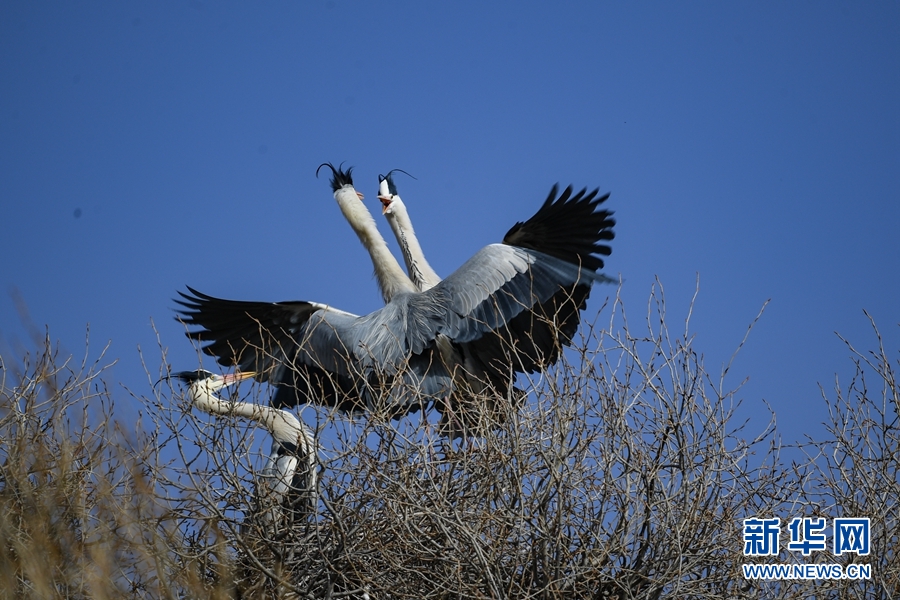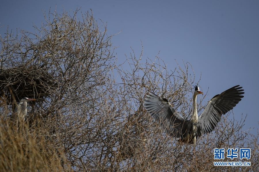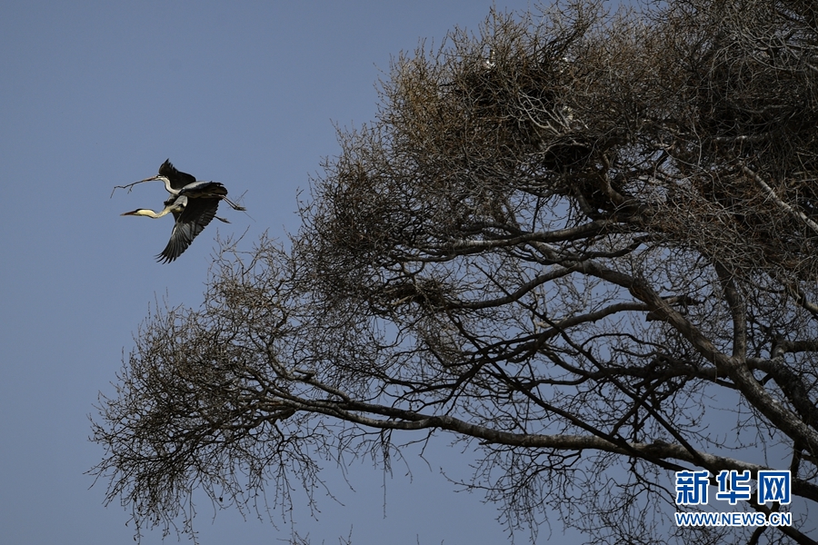 兩只蒼鷺來(lái)回飛舞忙碌建巢。新華網(wǎng) 卡婭梅朵 攝