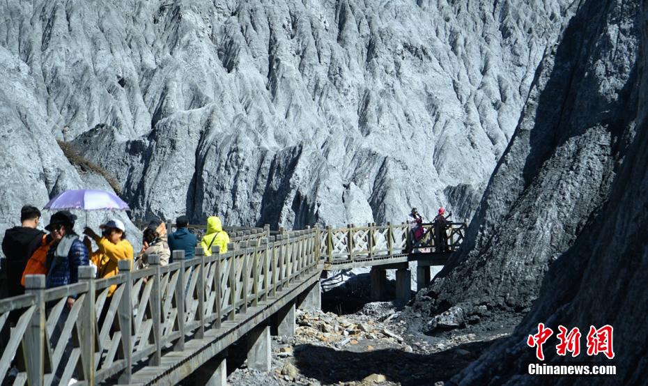 游人通過(guò)棧道進(jìn)入“土石林”深處。劉忠俊 攝