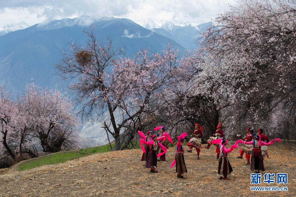 4月4日,在得榮縣徐龍鄉(xiāng)徐堆村,藏族群眾在桃花林下表演當(dāng)?shù)馗栉琛X央彈唱。新華社記者 江宏景 攝