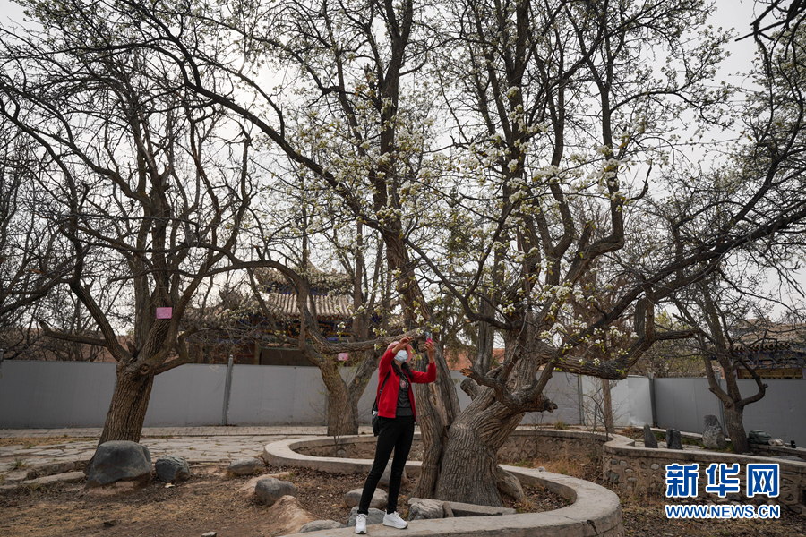 一名游客在梨花樹(shù)下拍照。新華網(wǎng) 潘彬彬 攝