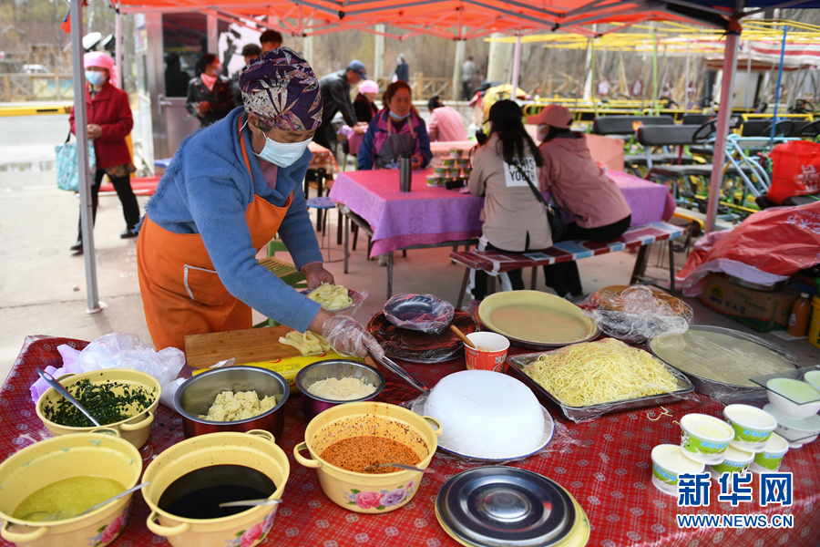 這兩天的貴德縣格外熱鬧,一簇簇雪白的梨花競(jìng)相綻放,引得許多“踏春人”來(lái)這里“打卡”。在貴德縣水車(chē)廣場(chǎng)旁邊的小吃攤上,許元梅把一碗調(diào)好的釀皮端給顧客,忙完之后,她又給下一位顧客打包好一份酸奶。最近,貴德縣的游客漸漸多了起來(lái),休息了一個(gè)冬天后,許元梅又支起了自己的小吃攤,為過(guò)往游客制作美食。