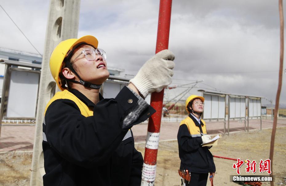 4月13日,青海省海北藏族自治州剛察縣,青藏鐵路公司西寧供電段哈爾蓋工區(qū),羅露露(左)手舉9米多長(zhǎng)的地線桿向接觸網(wǎng)上掛地線。中新社記者 馬銘言 攝