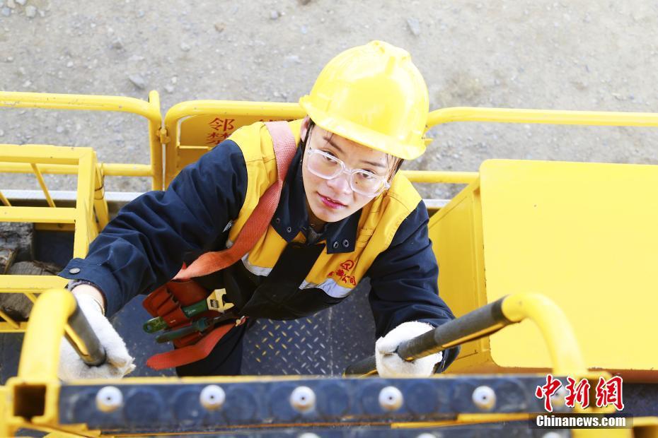 4月13日,青海省海北藏族自治州剛察縣,青藏鐵路公司西寧供電段哈爾蓋工區(qū),羅露露攀爬接觸網(wǎng)作業(yè)車。中新社記者 馬銘言 攝