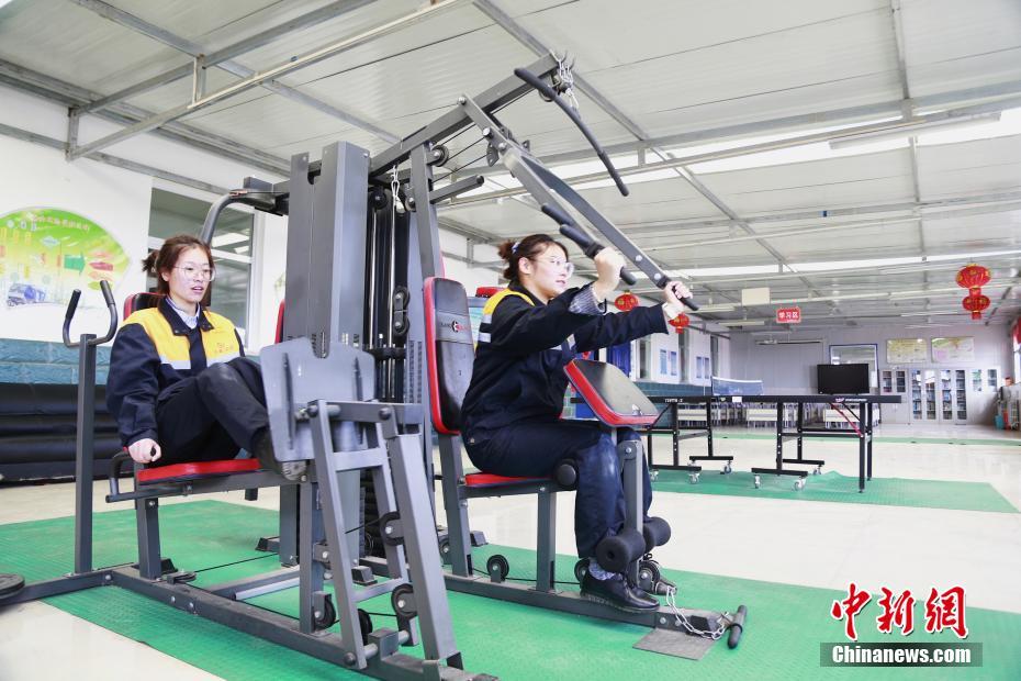 4月13日,青海省海北藏族自治州剛察縣,青藏鐵路公司西寧供電段哈爾蓋工區(qū),郭勝?gòu)?qiáng)(左)與羅露露一起健身鍛煉。中新社記者 馬銘言 攝
