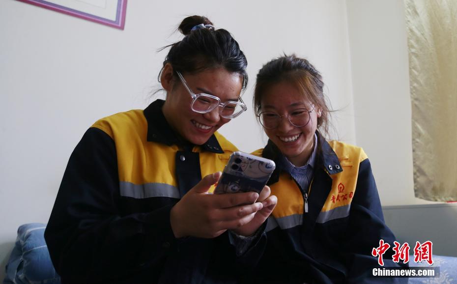 4月13日,青海省海北藏族自治州剛察縣,青藏鐵路公司西寧供電段哈爾蓋工區(qū)宿舍內(nèi),羅露露(左)與郭勝?gòu)?qiáng)在休息時(shí)間分享手機(jī)中的有趣內(nèi)容。中新社記者 馬銘言 攝
