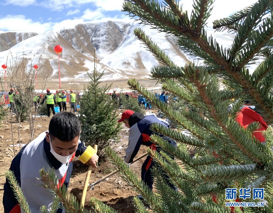 4月14日當(dāng)天,玉樹舉行植樹活動。圖為當(dāng)?shù)貙W(xué)生在距離玉樹市區(qū)約7公里的山坡植樹。新華社記者 李琳海 攝