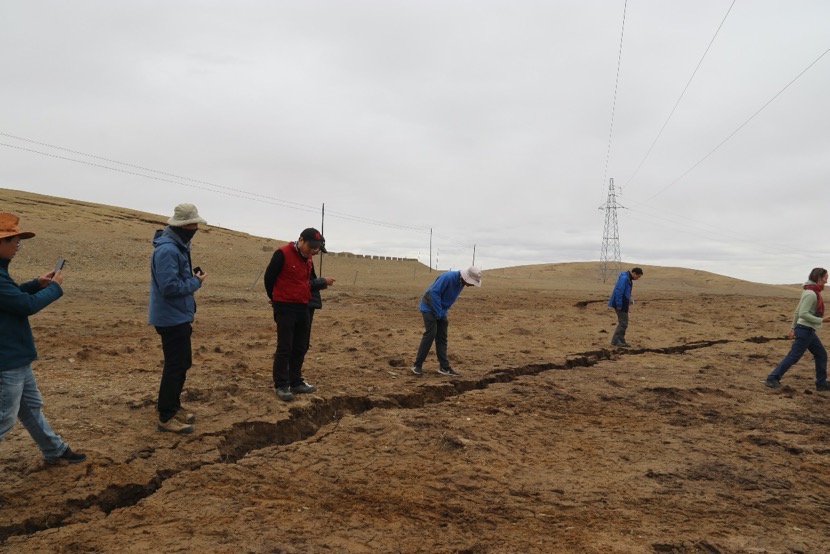 應(yīng)急考察隊(duì)相關(guān)負(fù)責(zé)人介紹,考察隊(duì)在白瑪納村附近發(fā)現(xiàn)地震次生破裂多處,黃河鄉(xiāng)附近向北西二十多公里地表破壞較為嚴(yán)重,破裂帶整體走向近120度,沿線隨處可見張裂隙、砂土液化等現(xiàn)象,路旁電線桿傾斜嚴(yán)重。接近G214國道一處地表破裂切過公路形成最大左行位錯(cuò)量。根據(jù)野外現(xiàn)象觀察,斷裂具有左行走滑兼正斷的運(yùn)動(dòng)學(xué)特性。