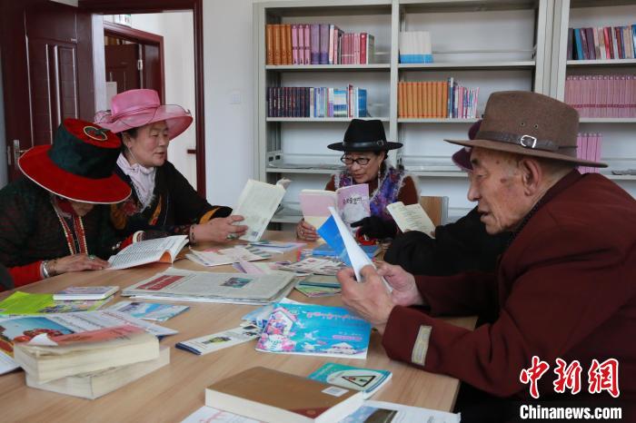 閱覽室內(nèi),三四位老人圍桌而坐,口中不停念著,“這是草原牧民口耳相傳的格薩爾詩篇,”德高說,隔壁房間的老人們正切磋藏棋、縫紉機前忙碌,“他們閑時編織門簾、口袋,放在‘愛心超市’展出、售賣,還把這種傳統(tǒng)手藝教給附近學校的小孩子。”