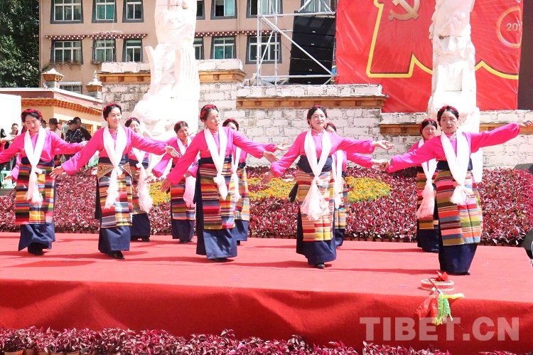 活動現(xiàn)場,黨旗國旗飄揚、哈達傳情,在一片歡騰的海洋里,大家載歌載舞齊唱光輝歲月,放聲歌頌幸福美好生活,盡情抒發(fā)高城兒女的愛黨愛國情懷。歌曲《翻身農(nóng)奴把歌唱》《草原上升起不落的太陽》,穿插吉祥老人頌詞和舞蹈。表達高原兒女在中國共產(chǎn)黨的領(lǐng)導下,翻身獲得解放,掌握了自己的命運。短短幾十年的發(fā)展過程,涉藏州縣迎來騰飛,經(jīng)濟社會發(fā)生了翻天覆地的變化,與祖國同步實現(xiàn)全面小康。