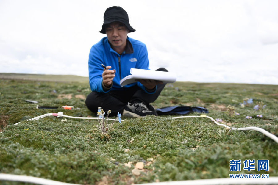 2021年長江源綜合科考的科考隊員任斐鵬在長江南源當曲地區(qū)觀察高寒草甸(7月23日攝)。新華社記者 張龍 攝