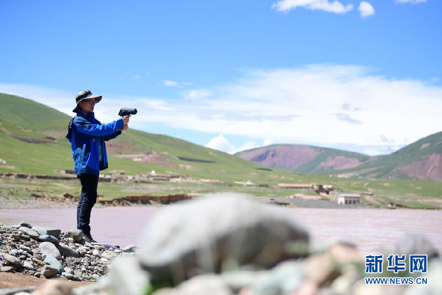 2021年長江源綜合科考的科考隊員陳鵬在通天河流域觀測河流流速(7月24日攝)。新華社記者 張龍 攝