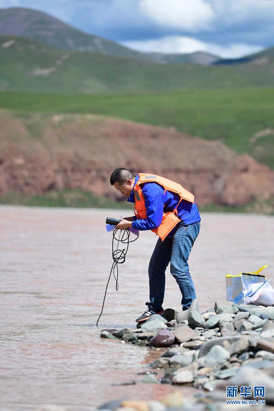 2021年長江源綜合科考的科考隊員趙良元在通天河流域觀測水文(7月24日攝)。新華社記者 張龍 攝