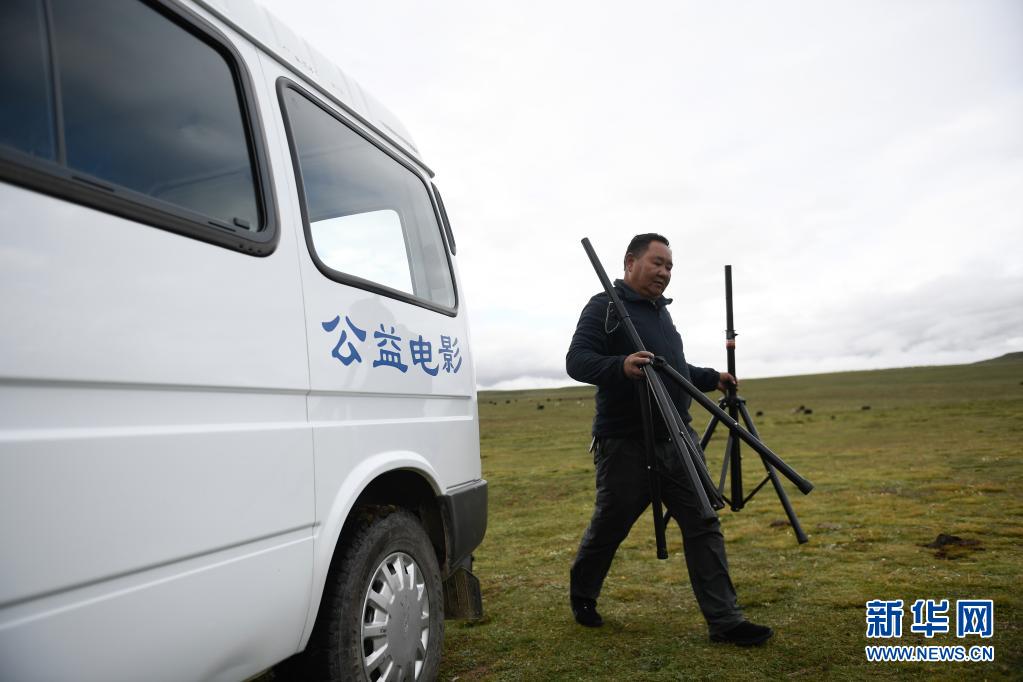 8月3日,在瑪沁縣當(dāng)洛鄉(xiāng)貢龍村的夏季草場上,南拉才讓在布置放映器材。新華社記者 李占軼 攝