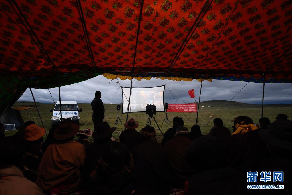 8月3日,在瑪沁縣當(dāng)洛鄉(xiāng)貢龍村的夏季草場上,牧民群眾在看電影。新華社記者 張龍 攝