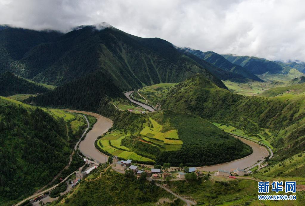 8月7日在青海省果洛藏族自治州班瑪縣境內(nèi)拍攝的村莊景色(無人機照片)。新華社記者 張龍 攝