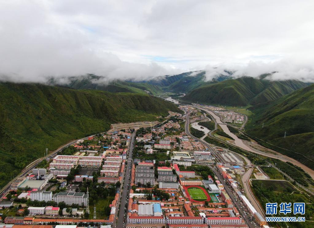 8月8日在青海省果洛藏族自治州班瑪縣境內(nèi)拍攝的縣城景色(無人機照片)。新華社記者 張龍 攝