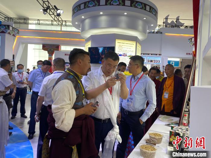 圖為在第22屆青洽會上,拉東才索南帶來了黑青稞酒、面等產(chǎn)品。受訪者供圖