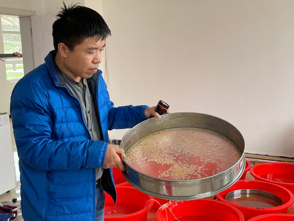 李偉正在查看孵化中的長(zhǎng)江源關(guān)鍵魚(yú)類(lèi)受精卵(6月23日攝)。