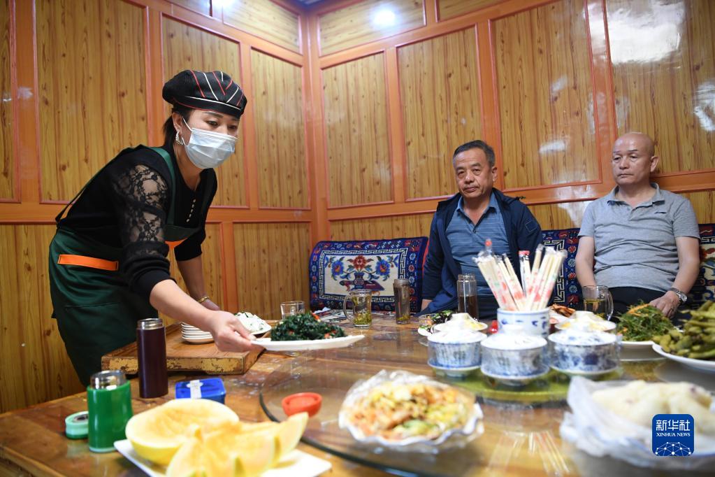 甘肅甘南卓尼縣木耳鎮(zhèn)力賽村村民李日占草(左)在自家的農(nóng)家樂里為客人上菜(9月11日攝)。新華社記者 陳斌 攝