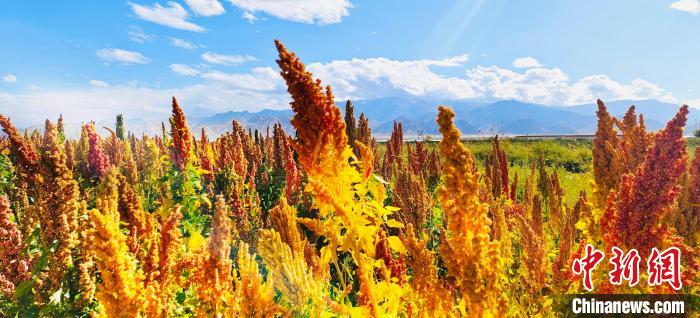 河西農場農民劉旦智種了30畝藜麥,紅色、白色、黑色的藜麥,在藍天白云的映襯下,勾勒出一幅高原秋收的美景圖?!敖衲贽见滈L勢不錯,一畝地大約600多斤,如果每斤按4塊錢算,一畝地可以收入3000多塊錢,經濟效益很不錯。我還種了40多畝枸杞,長勢跟去年差不多,1斤能賣20多塊錢?!眲⒌┲歉吲d地給記者算著賬。