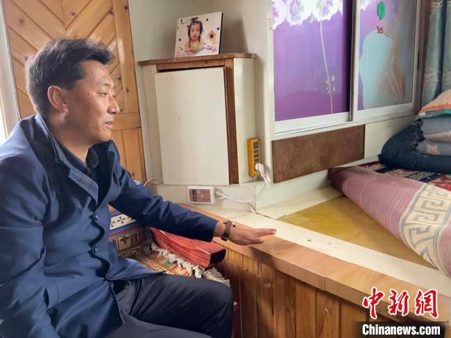 圖為合作市堅木克爾街道黨工委書記阿黑介紹村民家的碳纖維電熱炕板?!∷巫雨?攝