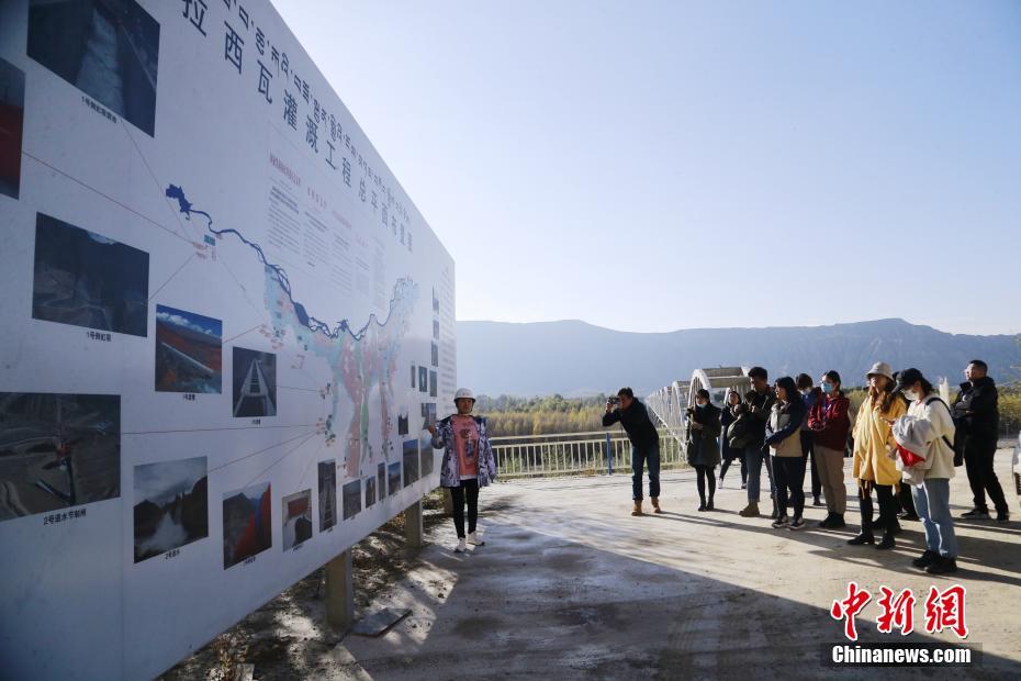 10月16日,青海省海南藏族自治州貴德縣拉西瓦灌溉工程建設(shè)點,工作人員向記者介紹該工程項目進(jìn)展。中新社記者 馬銘言 攝