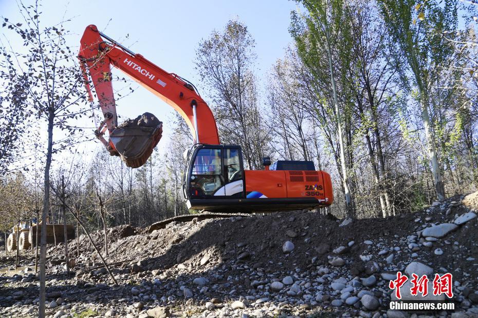 10月16日,青海省海南藏族自治州貴德縣拉西瓦灌溉工程中的一處建設(shè)點,工人用挖掘機(jī)施工。中新社記者 馬銘言 攝