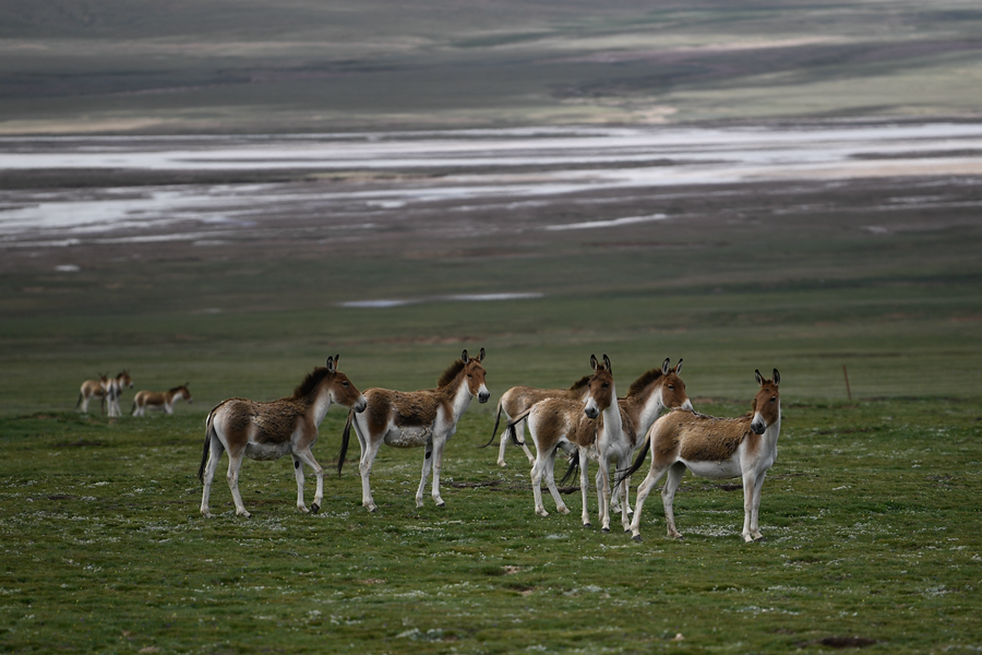 在三江源地區(qū),一群藏野驢在草原上活動(dòng)(7月25日攝)。新華社記者 張龍 攝