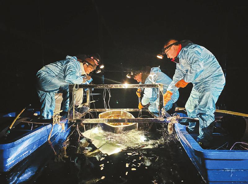 10月16日,科研人員在水切倫科夫探測器水池中安裝光電倍增管,它們被固定“懸”在水下,接收“散落”水中且產(chǎn)生切倫科夫光的宇宙線。