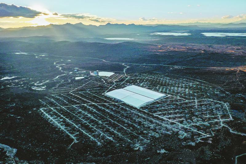 10月11日,無人機(jī)航拍的水切倫科夫探測器陣列,探測器總面積為7.8萬平方米,由兩個(gè)150米× 150米和一個(gè)300米× 110米水池組成。