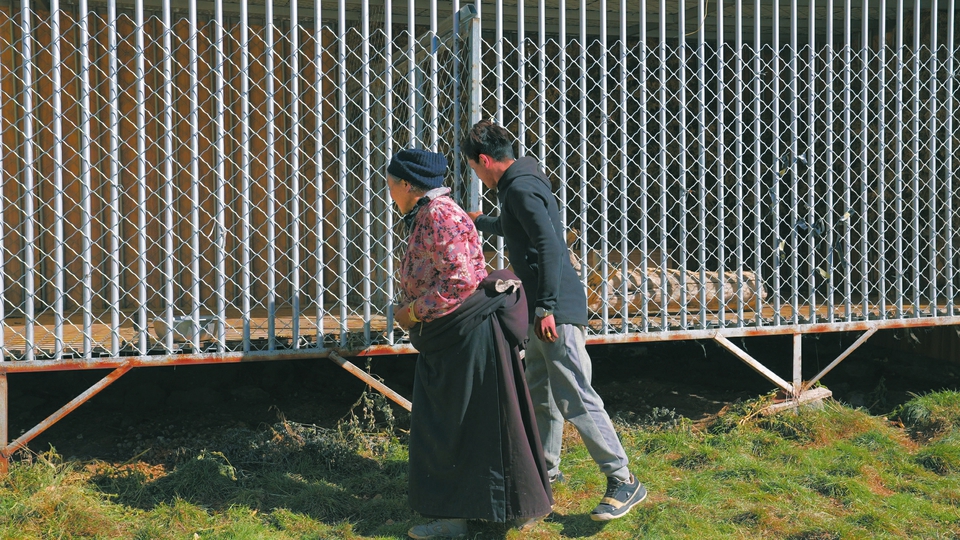 “在巖壁下發(fā)現(xiàn)了它,因?yàn)榱餮^多已經(jīng)奄奄一息了。它的一個前肢斷了,現(xiàn)在走路還是一瘸一拐的?!蓖瑸樽o(hù)林員的根呷介紹,當(dāng)時這只雪豹在同另外一只雪豹搶食落敗后受傷,因?yàn)檎孢_(dá)鄉(xiāng)尚未建立動物救助中心,雪豹便寄養(yǎng)在甲它家中。鄉(xiāng)政府出資修建了雪豹居住的“鐵籠”,甲它負(fù)責(zé)給它喂食,甲它的妻子則每隔一段時間就要為這頭猛獸打掃一次圈舍。