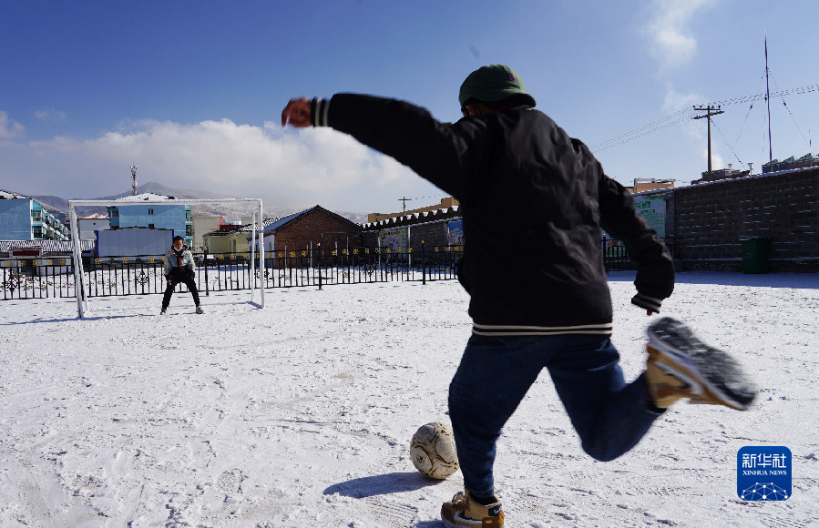 在青海省果洛藏族自治州瑪多縣地震災(zāi)后過渡安置一校區(qū)操場,孩子們在踢足球(12月18日攝)。