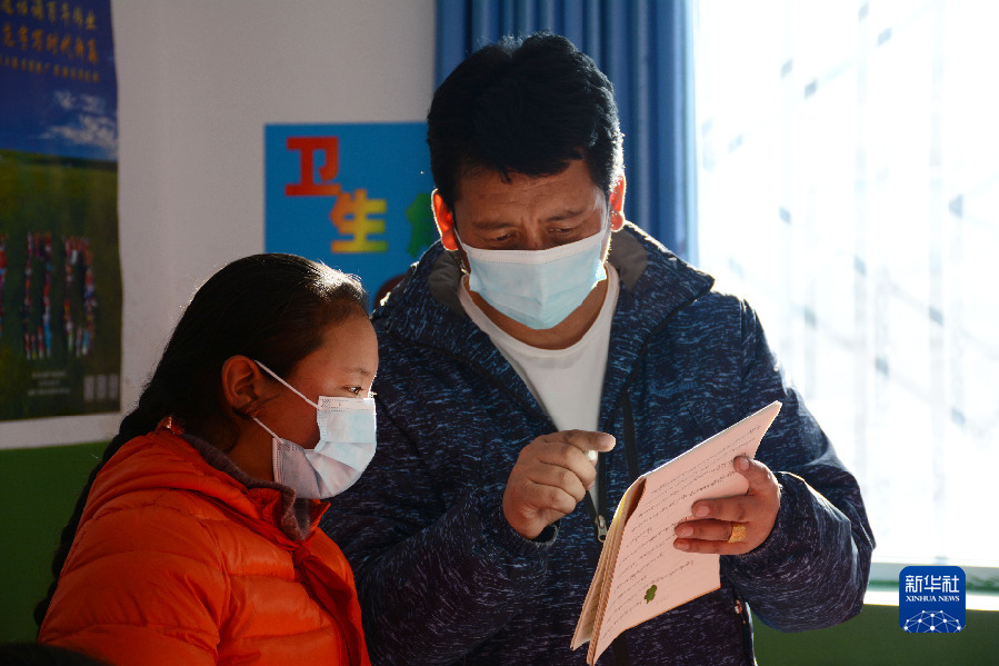 在青海省果洛藏族自治州瑪多縣地震災(zāi)后過渡安置一校區(qū)五年級二班,教師者才(右)在課堂上為學(xué)生輔導(dǎo)作業(yè)(12月18日攝)。